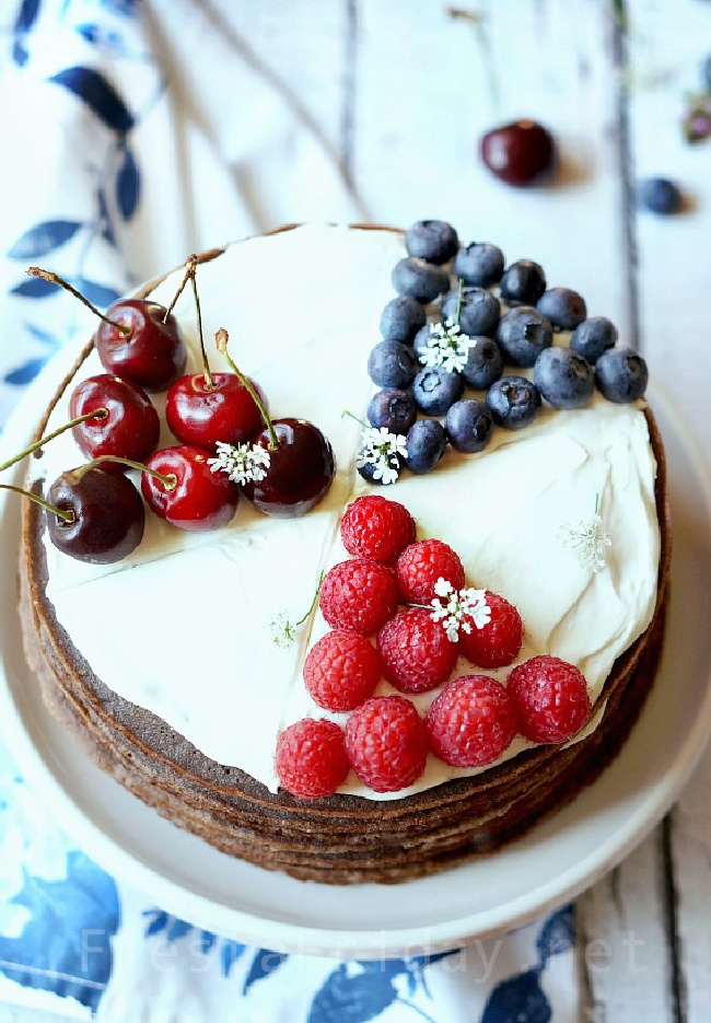 It’s time to correct that oversight. Let’s start flooding this space with all kinds of crepe cakes! Starting with this Chocolate Cheesecake Crepe Cake, which is not just about the perfect dessert for a hot Fourth of July day, but any other special occasion.