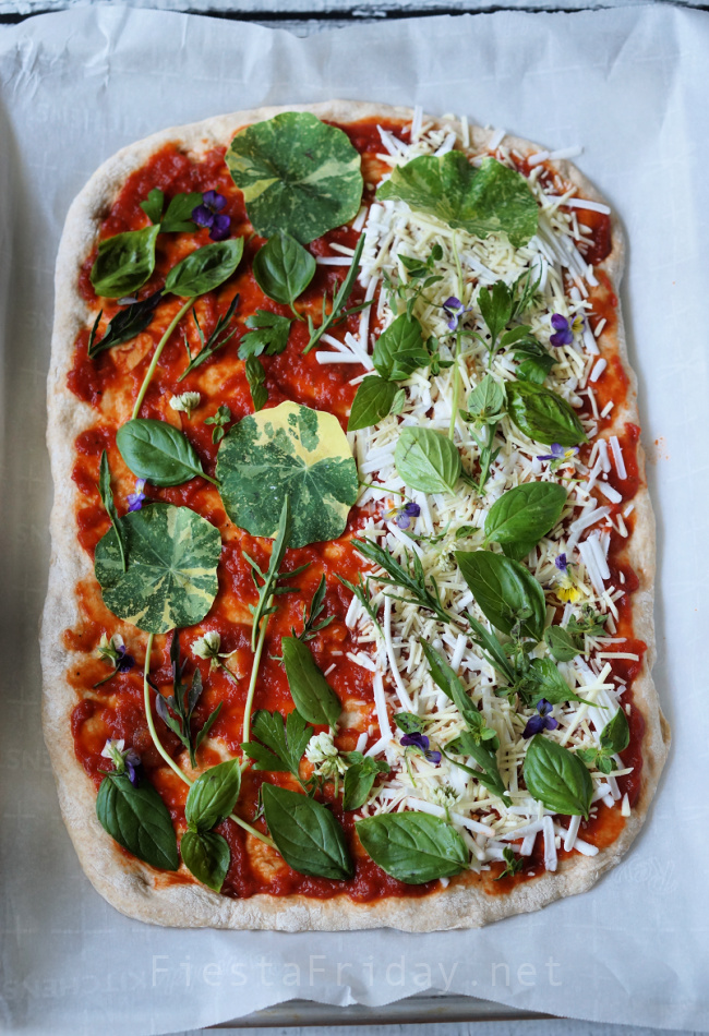 I used this shockingly easy no-knead focaccia recipe as my guide, sort of, then split the dough to make a focaccia and a half-and-half pizza.