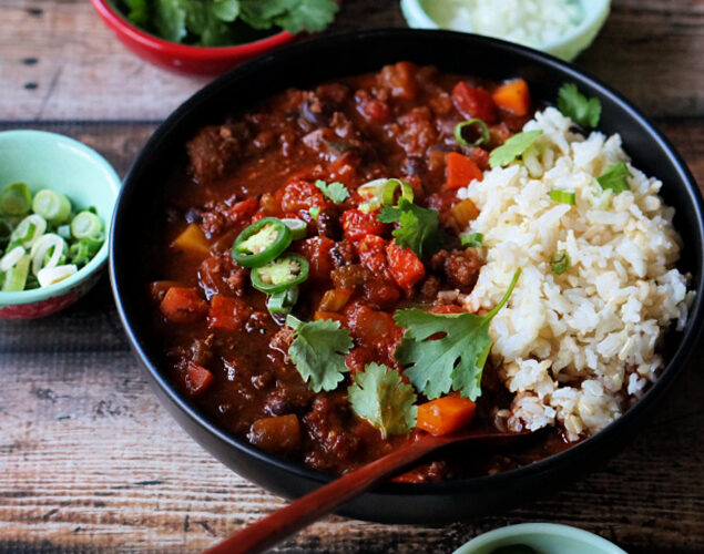 It was a stew-y kind of day yesterday! The cold and dreary weather called for something hot, like the Chili con Carne above. Considering the amount of vegetables I added, though, I could just as well call it Chili con Vegetales. It was excellent served with what my husband calls "the goodie-goodie rice", which is really just an equal mix of brown, white, and cauliflower rice. This is my way of ensuring that my family and I get plenty of vegetables. By blending them with a little bit of meat ... continue reading...